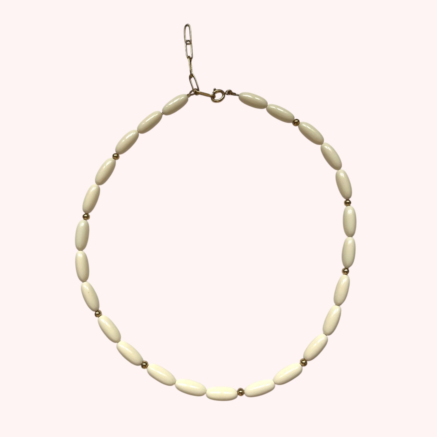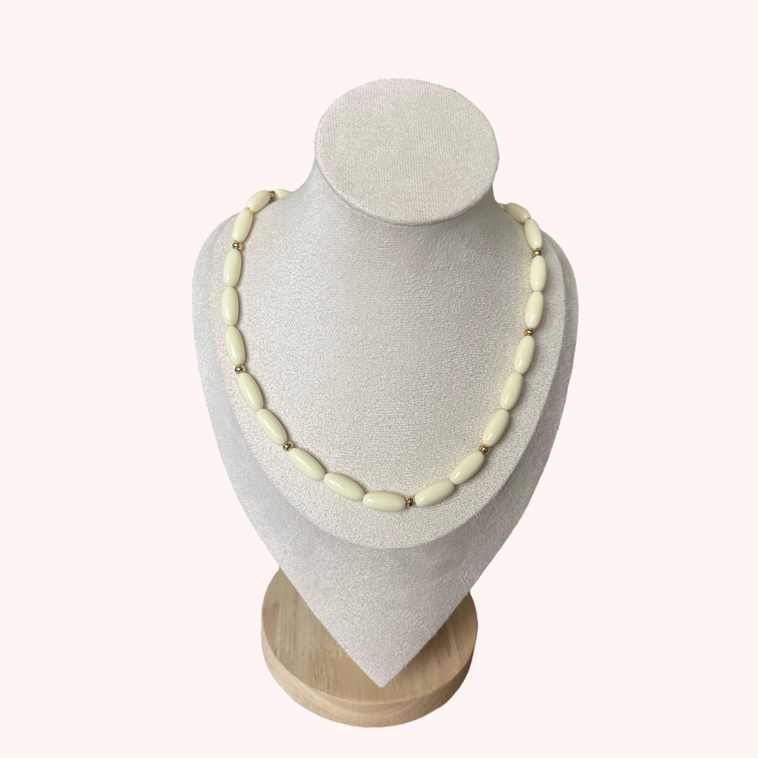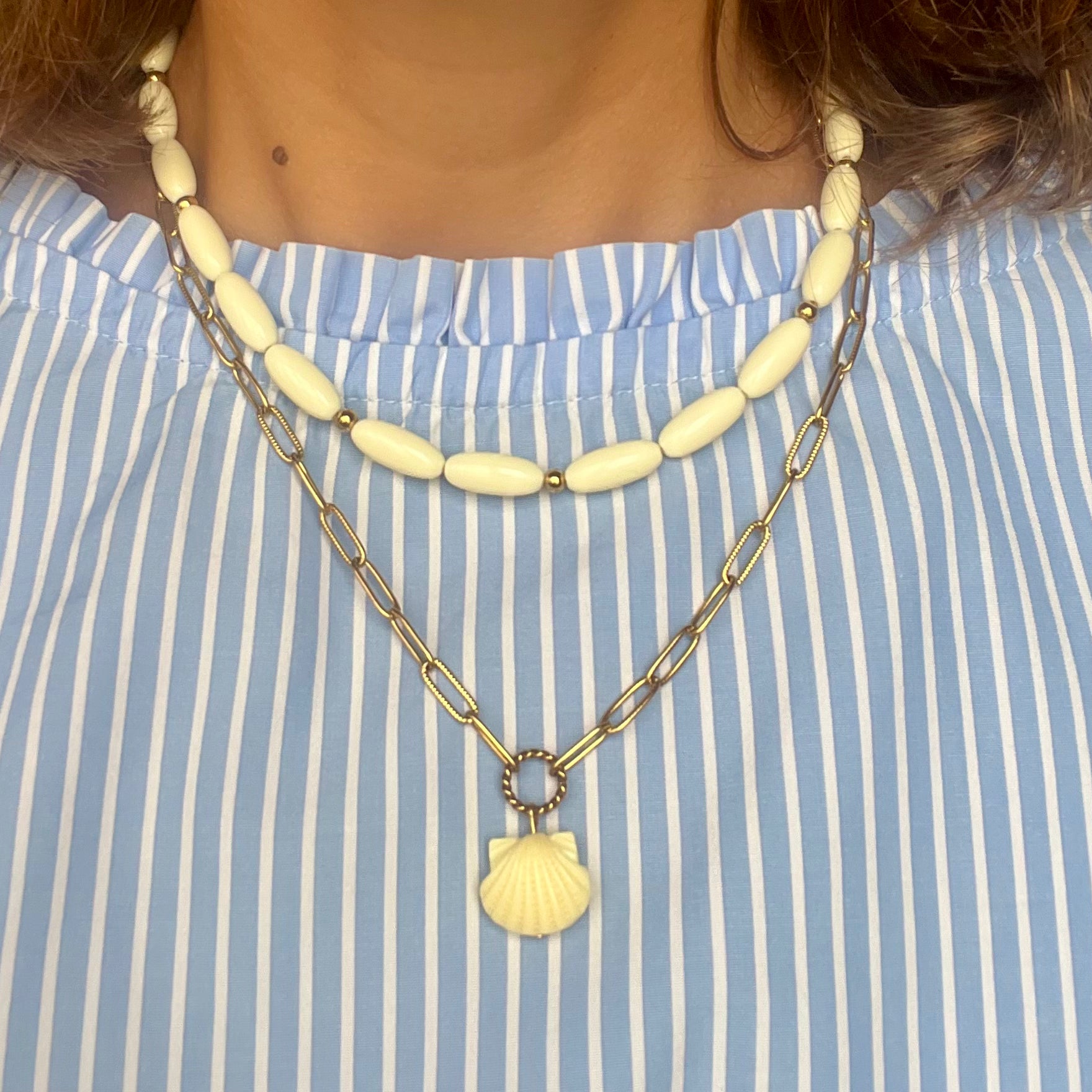 Un collier élégant qui complète toutes vos tenues. Ses perles allongées couleur écru sont délicatement rehaussées de petites touches dorées qui captent la lumière. D'une jolie longueur, il se suffit à lui-même ou se marie parfaitement en accumulation avec des chaînes.